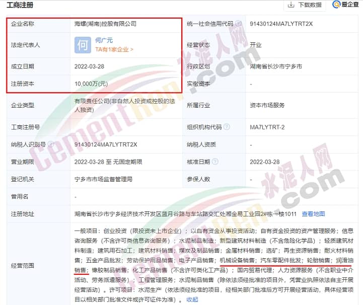 海螺(湖南)控股有限公司于2022年3月28日成立,法定代表人为何广元,注册资本1亿元,经营范围包含电子产品销售;机械设备销售;汽车零配件批发;轮胎销售;润滑油销售等。企查查股权穿透显示,该公司由海螺水泥100%控股。