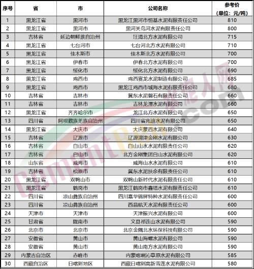 水泥人网信息中心数据显示,截止3月31日,重点监控的613家企业,P.O42.5散装水泥报价最高的是黑龙江省黑河市两家企业,报价在800-810元/吨,报价最低的是云南省玉溪市,三家企业报价在290-300元/吨。