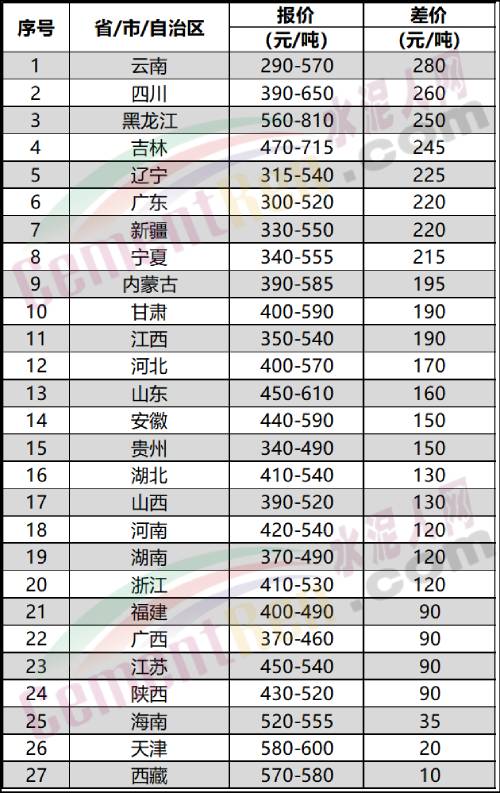 综合600多家企业数据,27个省市自治区内均有不同幅度的价差,价差在200元/吨以上的分别是云南、四川、黑龙江、吉林、辽宁、广东、新疆、宁夏等8个省自治区,其中云南省内不同区域间差价达280元/吨,其次是四川省内差价260元/吨。