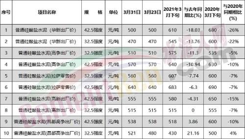 2020年同期数据显示,普通硅酸盐水泥32.5强度拉萨零售价为600元/吨,普通硅酸盐水泥42.5强度拉萨零售价为690元/吨,十家企业2020年同期报价较目前价格力十跌一升,跌幅在7%~26%。