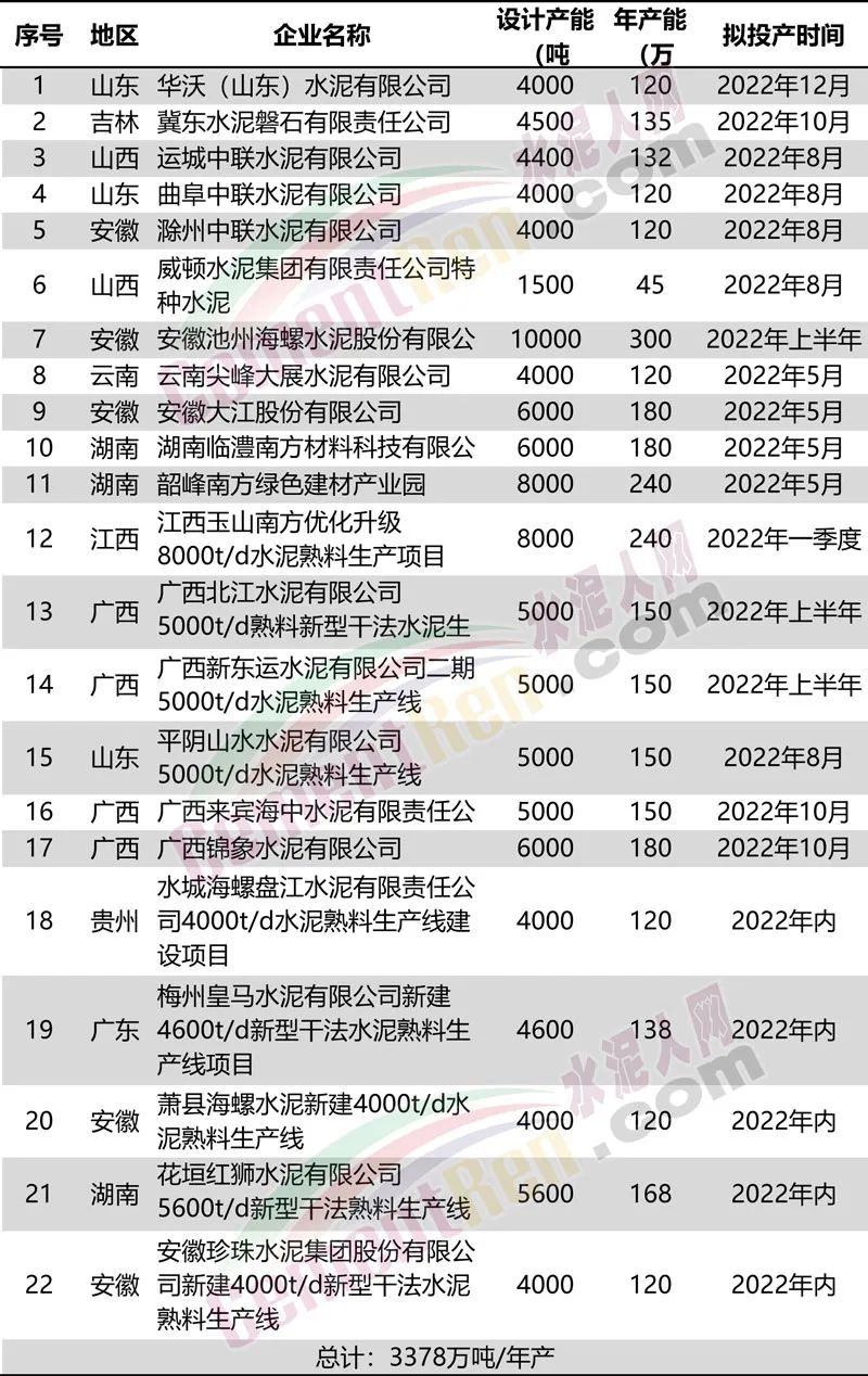 据水泥人网此前消息,2021年下半年点火投产的9个项目产能规模日产能达到52000吨,年产1560万吨。而且全部达到绿色、智能、超低排放要求。(相关链接:“抢滩”!多条“智能化”水泥生产线集中点火!)