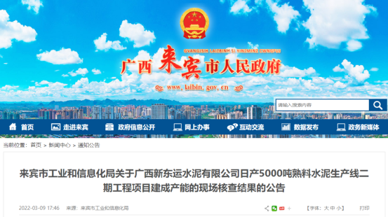日前广西来宾市工业和信息化局发布公告称,已于2022年3月1日,组织广西水泥行业协会专家组到广西新东运水泥有限公司已建成的5000t/d熟料水泥生产线二期工程项目产能进行现场核实并出具了核查一致结果公告。