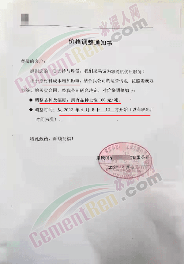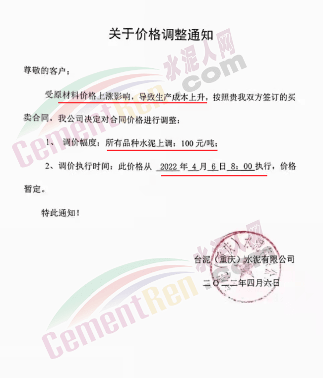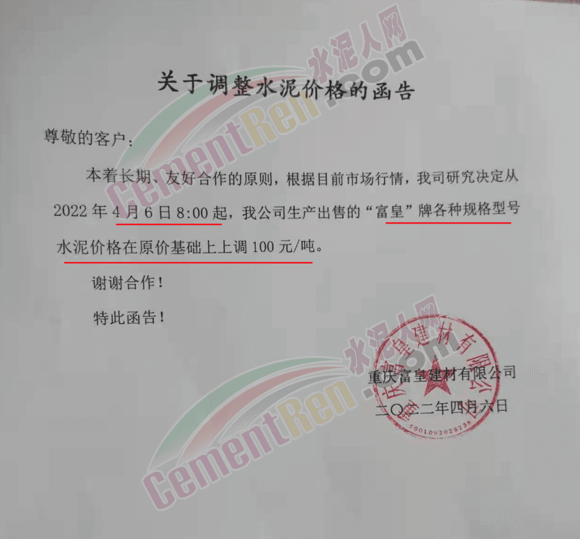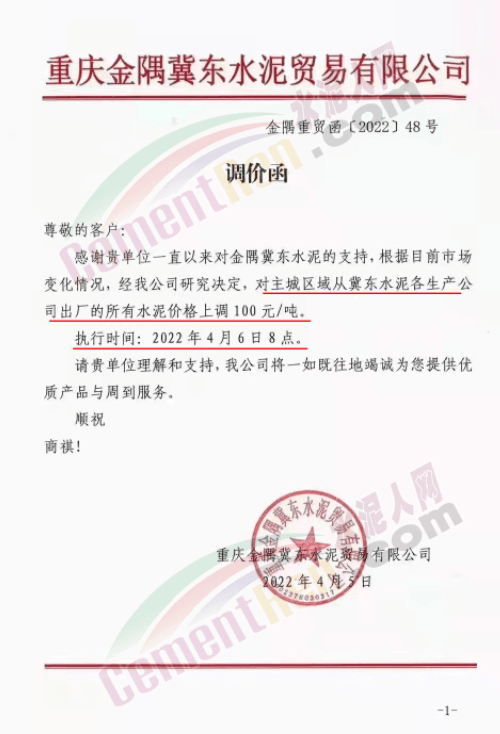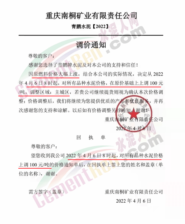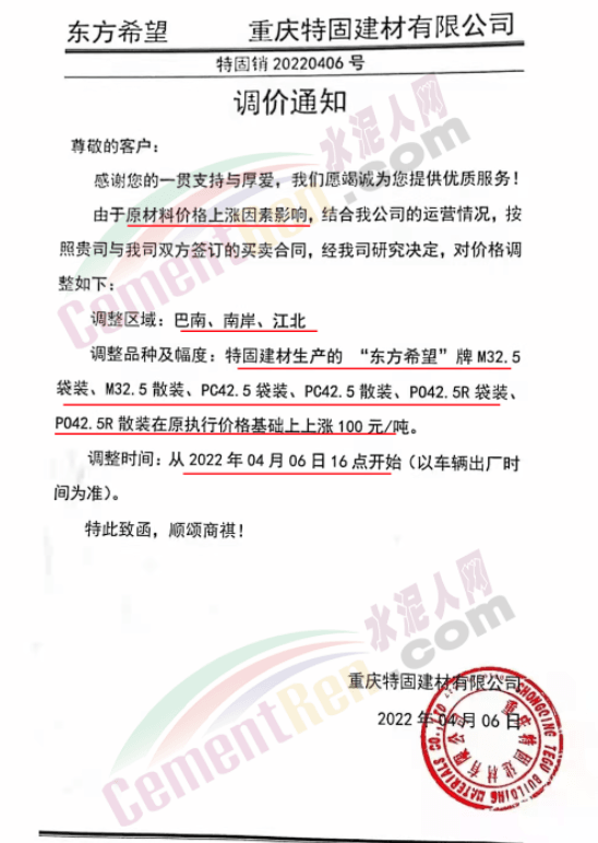 四川亿鑫联水泥有限公司通知,根据当前市场行情原材料成本上涨等情况,经公司研究决定自4月6日上午7时起,对各型号水泥在原价基础上上调100元/吨。