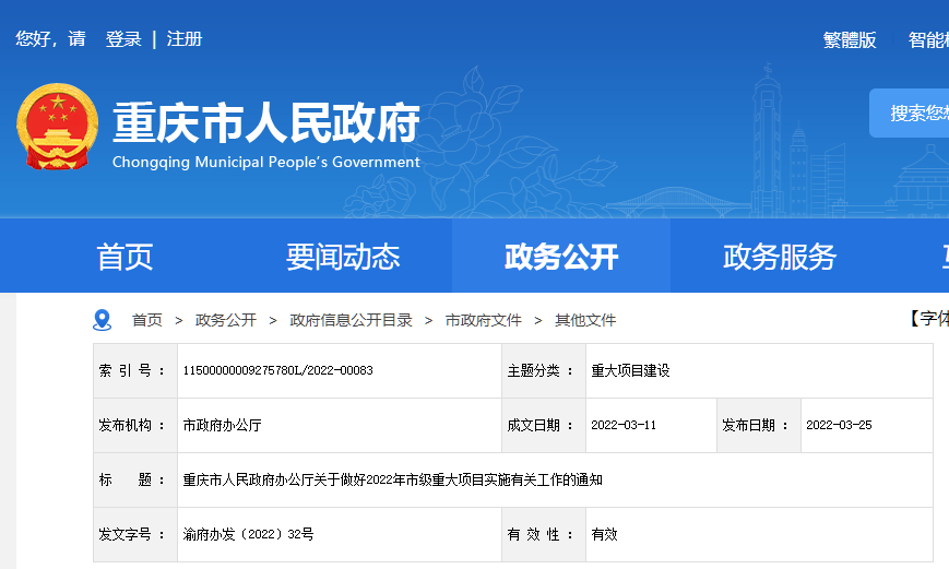 重庆市2022年市级重大建设项目