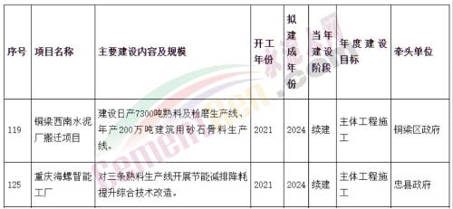 日前,为深入贯彻中央经济工作会议精神,全面落实市委经济工作会议要求和市政府工作报告安排部署,持续深化“抓项目稳投资”专项行动,重庆市人民政府办公厅印发了《关于做好2022年市级重大项目实施有关工作的通知》,加快推进2022年市级重大项目实施,其中包括铜梁西南水泥厂搬迁建设日产7300吨熟料及粉磨生产线、年产200万吨建筑用砂石骨料生产线以及重庆海螺智能工厂对三条熟料生产线开展节能减排降耗提升综合技术改造两大项目。