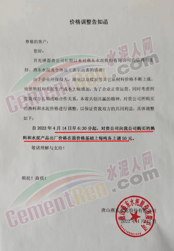 唐山燕东水泥通知称,由于企业环保投入,限电及煤炭等其它原材料价格不断上涨,致使熟料和水泥生产成本大幅增加,为了企业正常运营,自4月14日早6点30分起,对熟料和水泥价格上调50元/吨。