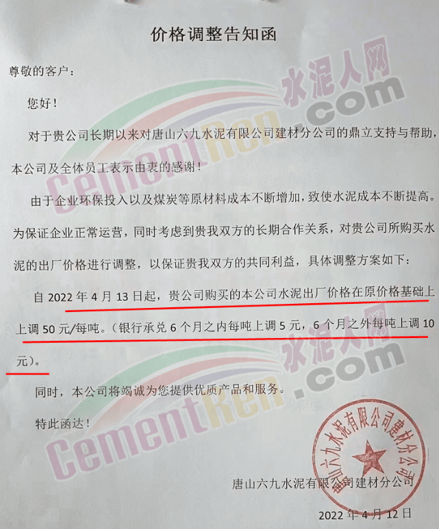 唐山六九水泥有限公司建材分公司通知自4月13日起,上调水泥价格50元/吨,银行承兑6个月之内上调5元/吨,6个月之外上调10元/吨。