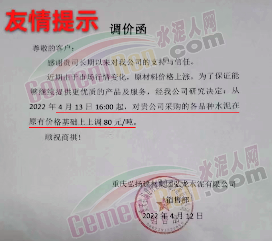 重庆弘扬建材集团弘龙水泥有限公司通知,由于市场行情变化,原材料价格上涨,为了保证能够继续提供更优质的产品及服务,经公司研究决定从4月13日16时起,上调各品种水泥价格80元/吨。