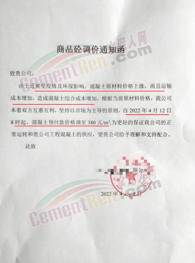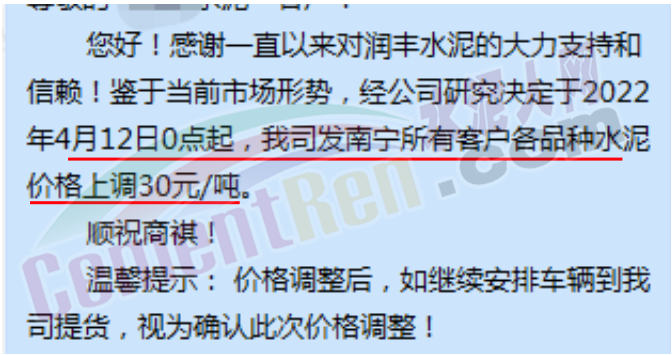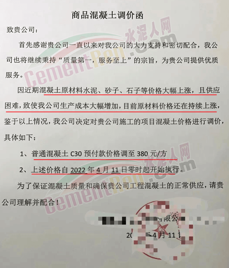 另一企业调价通知提到,原材料价格持续上涨,造成混凝土成本大幅上涨,公司通过内部控制挖潜已经无法克服原材料持续上涨带来的成本压力,为确保混凝土质量,满足供应,经过多方面考虑,决定自4月12日起上调价格30元/立方。