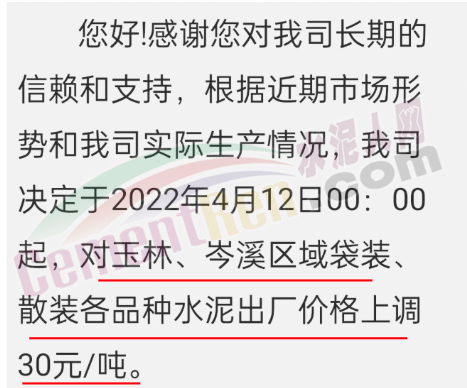 河北中达集团有限责任公司水泥厂通知由于疫情原因各原材料供应不足,价格持续上涨,环保管控力度加大等诸多因素影响,生产经营难度增大,生产成本上升,为保证公司的正常生产经营,各品种水泥自4月12日上午8时在原价基础上上调30元/吨。