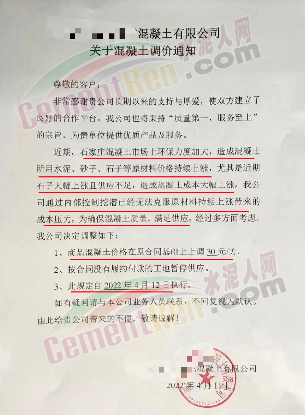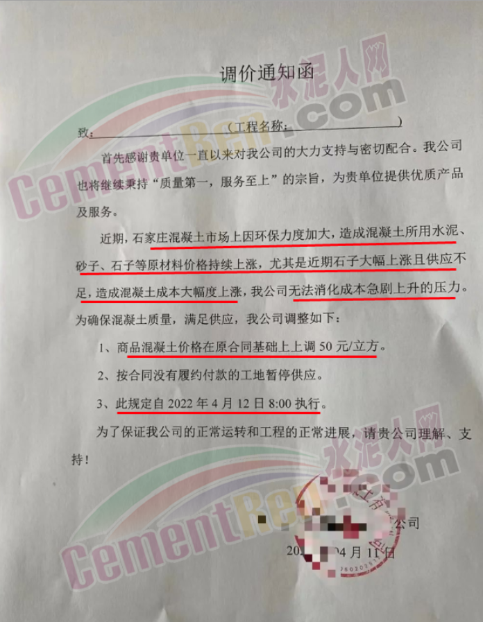 一企业通知函称,近期石家庄混凝土市场上因环保力度加大,造成混凝土所用水泥、砂子、石子等原材料价格持续上涨,尤其是近期石子大幅上涨且供不应求,造成混凝土成本大幅度上涨,公司无法消化成本急剧上升的压力,为确保混凝土质量,商品混凝土价格从4月12日8时起在原合同基础上上调50元/立方。