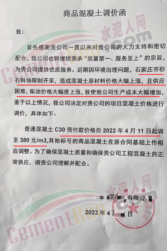 另一企业通知称,近期因环境治理问题,石家庄市砂石料场限制开采,造成混凝土原材料价格大幅上涨,且供应困难,柴油价格大幅度上涨,致使公司生产成本大幅增加,鉴于以上情况,公司决定自4月11日起普通混凝土C30预付款价格调至380元/立方。其他标号的商品混凝土在原合同基础上作相应调整 。