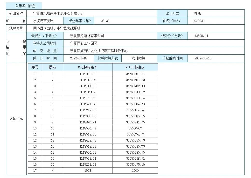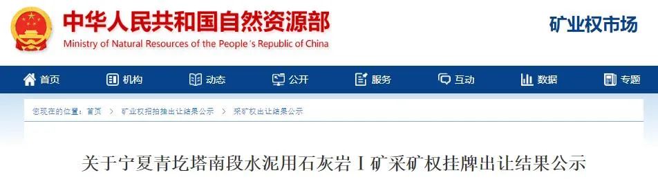 近日,自然资源部发布了关于宁夏青圪塔南段水泥用石灰岩Ⅰ矿采矿权挂牌出让结果公示。中国水泥网从公示中得知宁夏豪龙建材以1.25亿元竞得了该矿山采矿权。