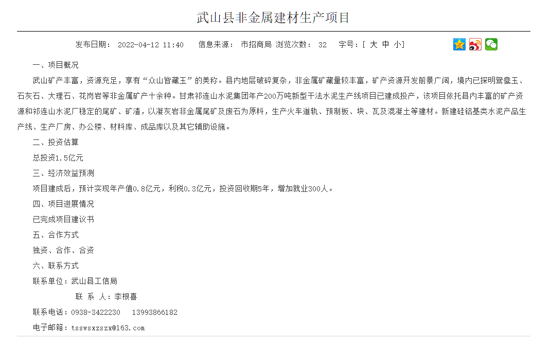 日前,甘肃天水市招商局发布了《武山县非金属建材生产项目》招商引资推介项目消息称,甘肃祁连山水泥集团年产200万吨新型干法水泥生产线项目已建成投产,该项目依托县内丰富的矿产资源和祁连山水泥厂稳定的尾矿、矿渣,以凝灰岩非金属尾矿及废石为原料,生产火车道轨、预制板、块、瓦及混凝土等建材。新建硅铝基类水泥产品生产线、生产厂房、办公楼、材料库、成品库以及其它辅助设施。