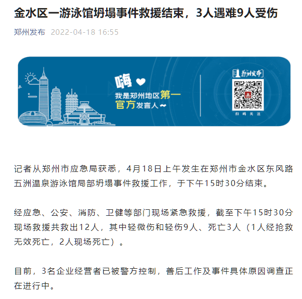 郑州发布官微4月18日16:55分消息,4月18日上午发生在郑州市金水区东风路五洲温泉游泳馆局部坍塌事件救援工作于下午15时30分结束。