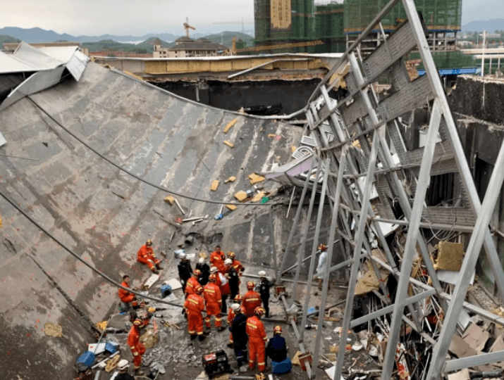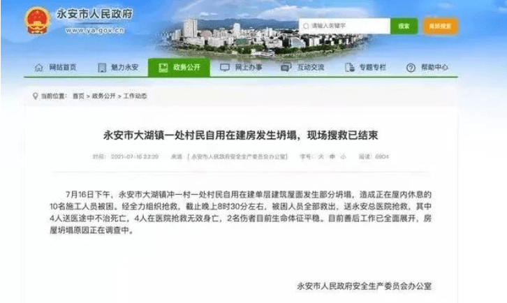 ▲2021年7月16日,福建三明永安市大湖镇冲一村一处村民自用在建单层建筑屋面发生部分坍塌,造成正在屋内休息的10名施工人员被困。其中4人送医途中不治死亡,4人在医院抢救无效身亡。
