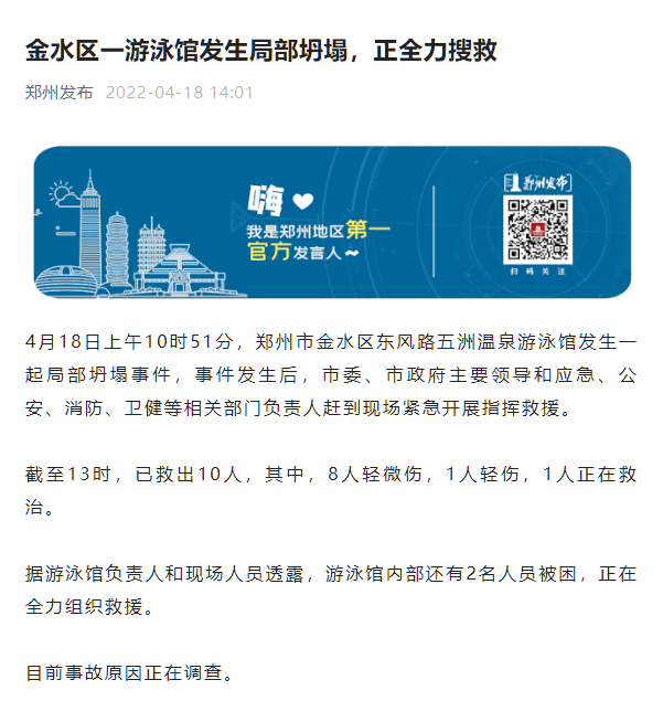 据郑州发布官微18日下午14:01分消息,4月18日上午10时51分,郑州市金水区东风路五洲温泉游泳馆发生一起局部坍塌事件,事件发生后,市委、市政府主要领导和应急、公安、消防、卫健等相关部门负责人赶到现场紧急开展指挥救援。截至13时,已救出10人,其中,8人轻微伤,1人轻伤,1人正在救治。据游泳馆负责人和现场人员透露,游泳馆内部还有2名人员被困,正在全力组织救援。