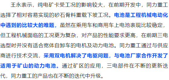同力重工自2014年起便开始研发新能源相关产品,曾经在增程技术,混联技术,分布式混合驱动技术,纯电技术,氢燃料电池技术等几乎所有的电动化技术方面进行尝试,并形成了完善、全面的技术积累。同力重工现已形成全系列纯电动业务矿卡板块,主要产品包括增程式电动矿卡TLH90B、混联电动矿卡TLH90C,纯电动矿卡包括60吨级TLE90A/B,70吨级TLE105(充电模式)和TLE105C(换电模式)两种类型。同力重工在非公路用车领域凭借多年的积累,可靠耐用的产品、优质高效的服务引领着非公路用车领域的潮流。