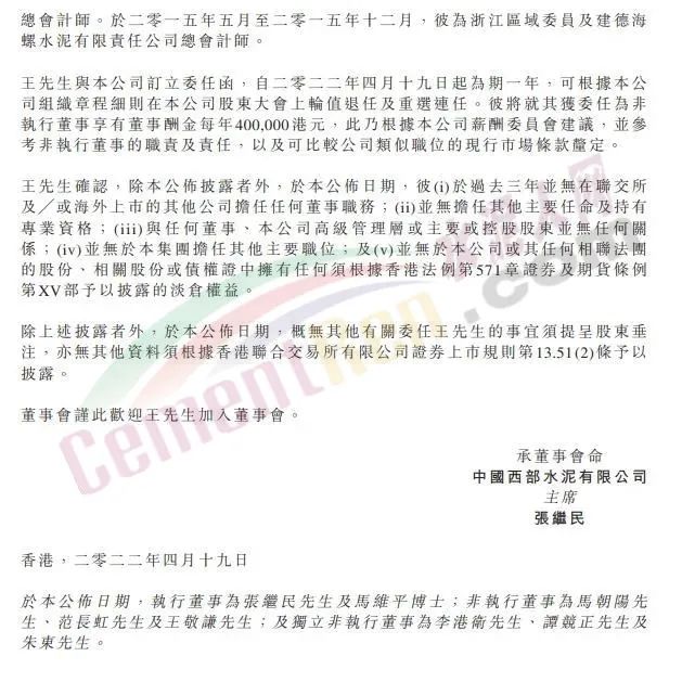 4月19日,西部水泥发布公告,侍光磊先生因调整工作安排而辞任非执行董事;王敬谦先生已获委任为非执行董事,自2022年4月19日起生效。