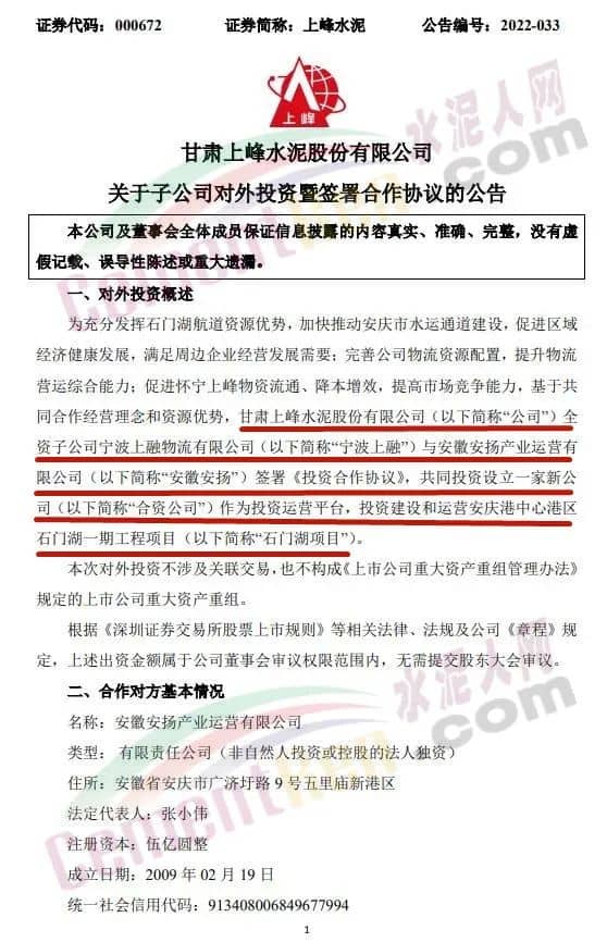 日前,上峰水泥发布公告,为充分发挥石门湖航道资源优势,加快推动安庆市水运通道建设,促进区域经济健康发展,满足周边企业经营发展需要;完善公司物流资源配置,提升物流营运综合能力;促进怀宁上峰物资流通、降本增效,提高市场竞争能力,基于共同合作经营理念和资源优势,公司全资子公司宁波上融物流有限公司与安徽安扬产业运营有限公司签署《投资合作协议》,共同投资设立一家新公司作为投资运营平台,投资建设和运营安庆港中心港区石门湖一期工程项目。