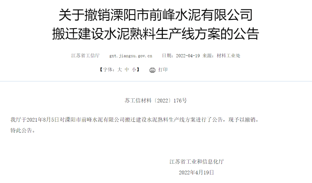 4月19日,江苏省工信厅发布《关于撤销溧阳市前峰水泥有限公司搬迁建设水泥熟料生产线方案的公告》称,江苏省工信厅于2021年8月5日对溧阳市前峰水泥有限公司搬迁建设水泥熟料生产线方案进行了公告,现予以撤销。