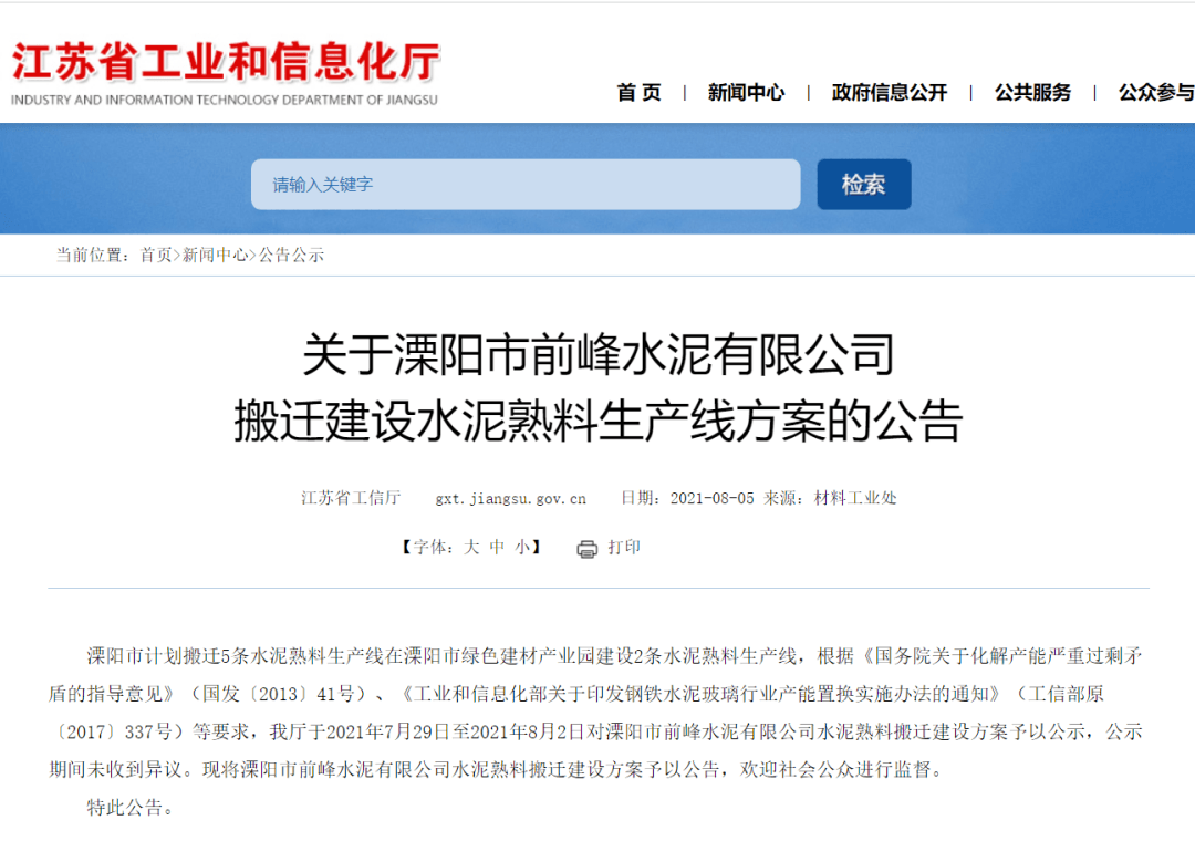 江苏省工信厅2021年8月5日公告显示,溧阳市计划搬迁5条水泥熟料生产线在溧阳市绿色建材产业园建设两条水泥熟料生产线。根据相关文件要求,江苏省工信厅于2021年7月29日至2021年8月2日对溧阳市前峰水泥有限公司水泥熟料搬迁建设方案予以公示,公示期间未收到异议。并将溧阳市前峰水泥有限公司水泥熟料搬迁建设方案予以公告,欢迎社会公众进行监督。
