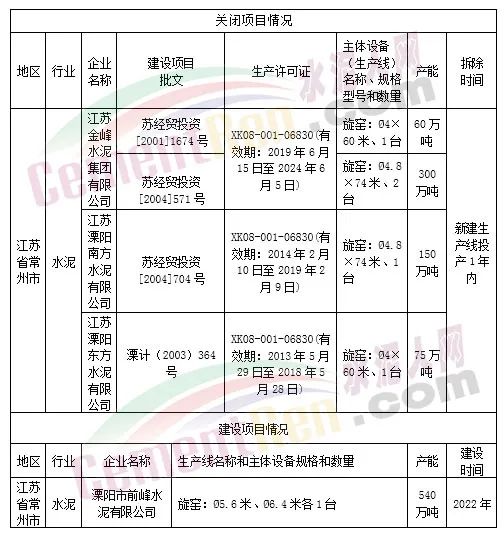 公告附件可见,关闭项目包括江苏金峰水泥集团3条熟料生产线,江苏溧阳南方水泥1条熟料生产线以及溧阳东方水泥1条熟料生产线。