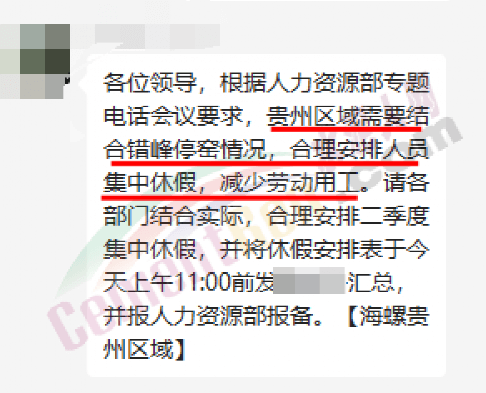 日前,海螺水泥贵州区域发通知称,根据人力资源部专题电话会议要求,贵州区域需要结合错峰停窑情况,合理安排人员集中休假,减少劳动用工。请各部门结合实际,合理安排二季度集中休假,并将休假安排表汇总报人力资源部报备。