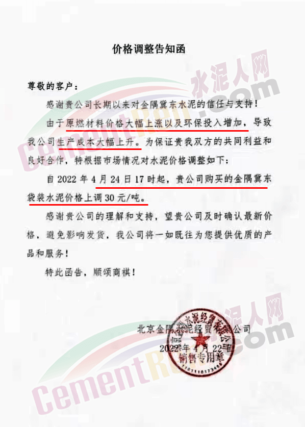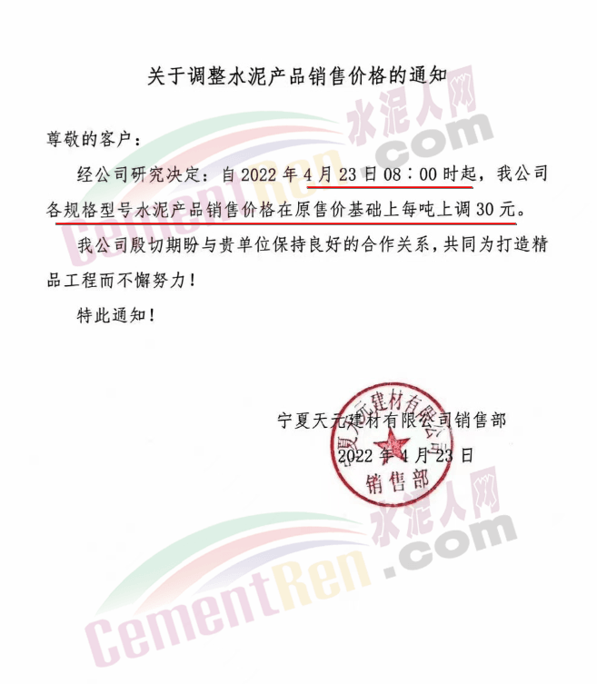 宁夏天元建材有限公司销售部通知,自2022年4月23日8时起,公司各规格型号水泥产品销售价格在原售价基础上每吨上调30元。
