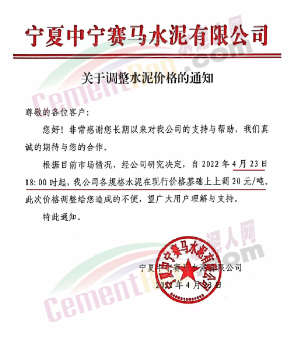 宁夏中宁赛马水泥有限公司通知,根据目前市场情况,经公司研究决定,自2022年4月23日18时起,公司各规格水泥在现行价格基础上上调20元/吨。