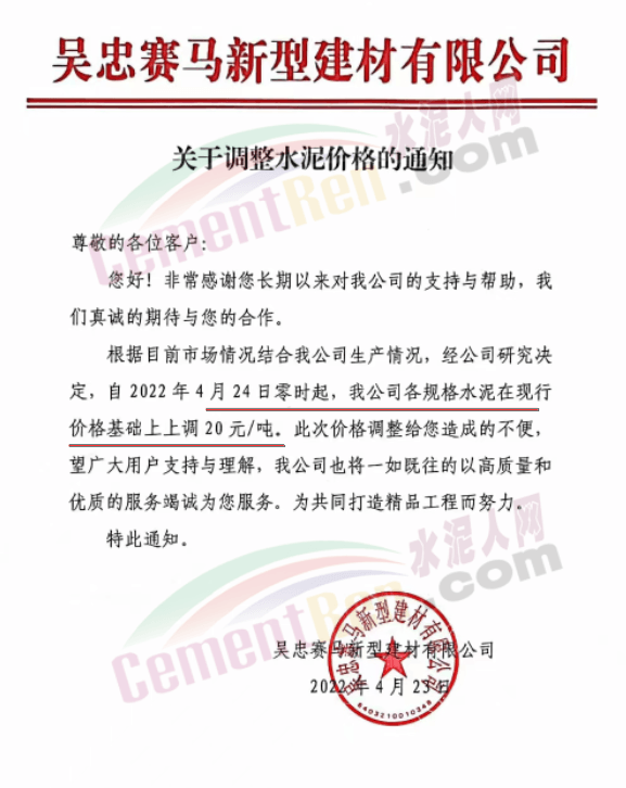 吴忠赛马新型建材有限公司通知,根据目前市场况结合公司生产情况,自2022年4月24日零时起,公司各规格水泥在现行价格基础上上调20元/吨。