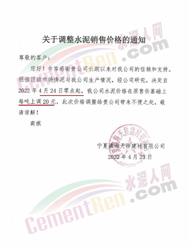宁夏瀛海天祥建材有限公司通知,根据目前市场情况与公司生产情况,经公司研究,决定自2022年4月24日零点起,公司水泥价格在原售价基础上上调20元/吨。