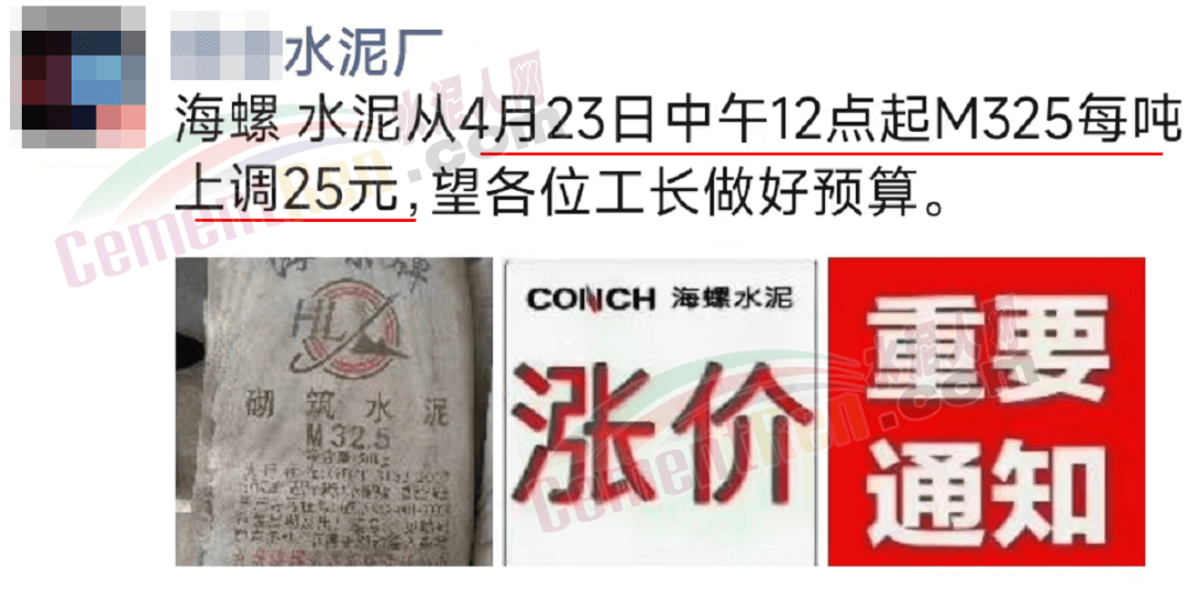 同日,陕西关中地区海螺水泥通知从4月23日中午12点起M325砌筑水泥上调25元/吨。