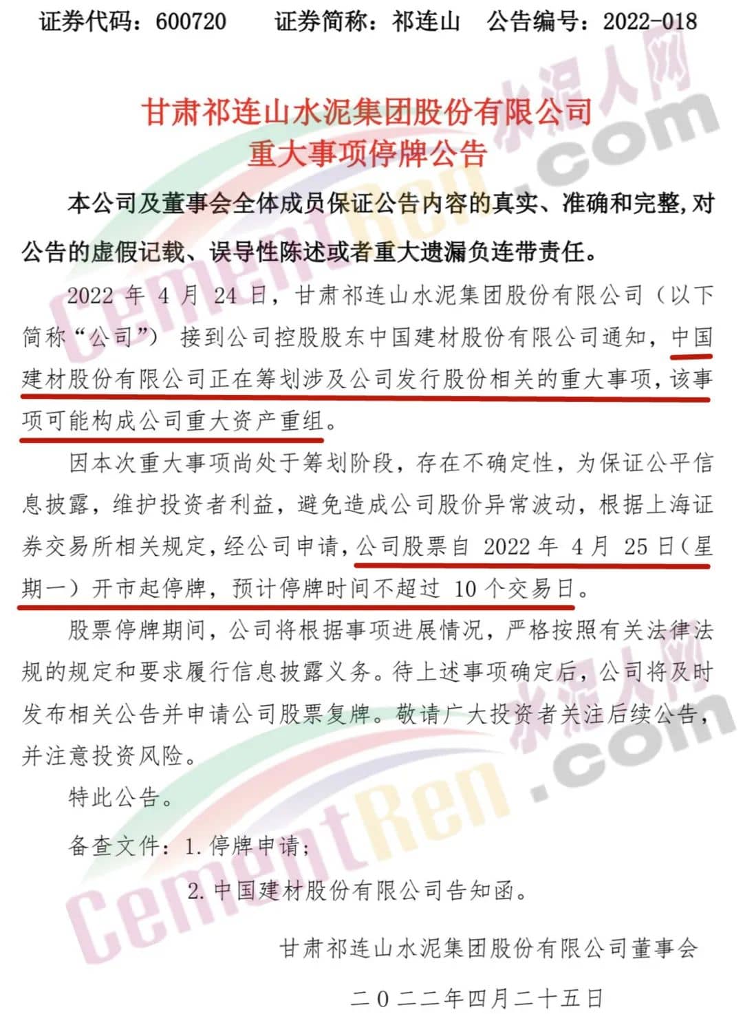 4月25日,甘肃祁连山水泥集团股份有限公司发布公告称,中国建材股份有限公司正在筹划涉及祁连山水泥发行股份相关的重大事项,该事项可能构成公司重大资产重组。祁连山水泥股票自2022年4月25日开市起停牌,预计停牌时间不超过10个交易日。