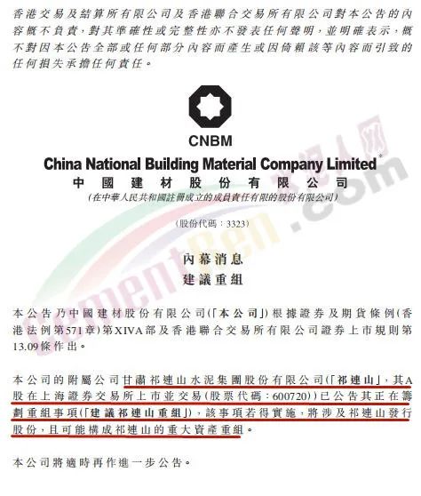 同日,中国建材也发布公告,公司附属公司甘肃祁连山水泥集团股份有限公司已公告其正在筹划重组事项,该事项若得实施,将涉及祁连山发行股份,且可能构成祁连山的重大资产重组。