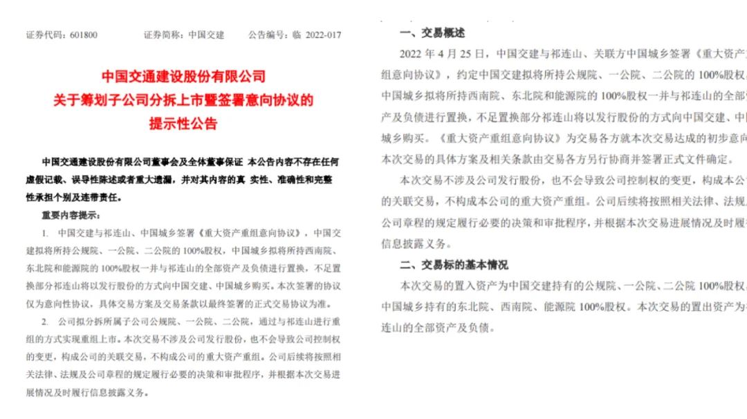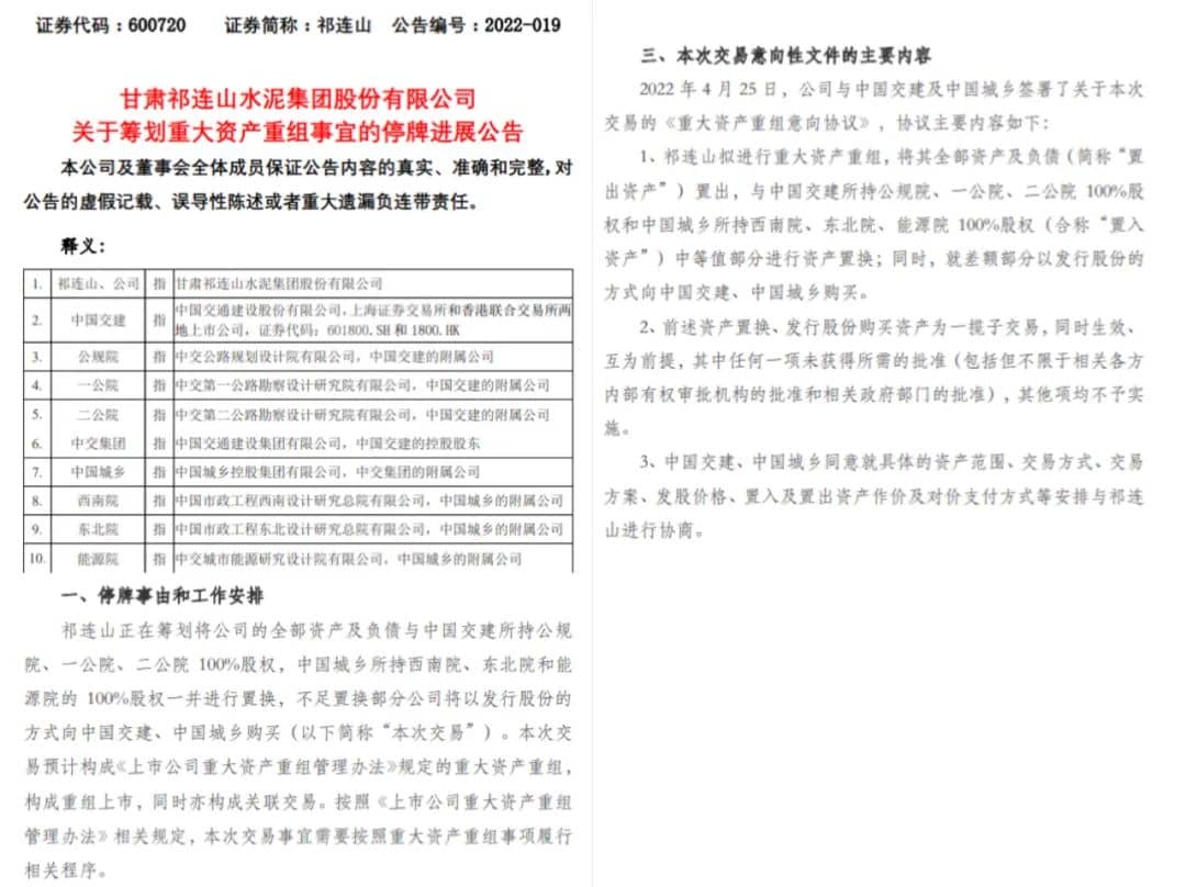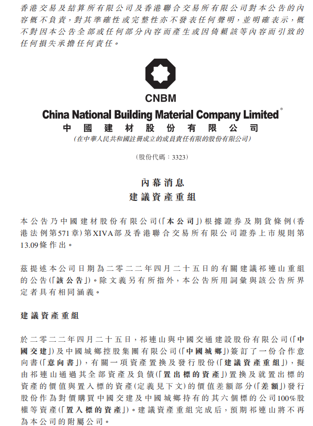 当日中国建材发布公告称,于2022年4月25日,祁连山与中国交通建设股份有限公司及中国城乡控股集团有限公司签订了一份合作意向书,有关一项资产置换及发行股份,拟由祁连山通过其全部资产及负债置换及就置出标的资产的价值与置入标的资产的价值差额部分发行股份作为对价购买中国交建及中国城乡持有的其六个标的公司100%股权等资产。建议资产重组完成后,预期祁连山将不再为公司的附属公司。