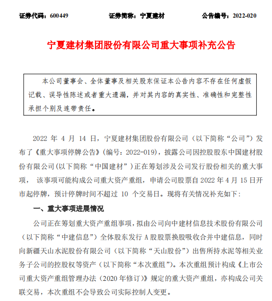 4月15日晚,宁夏建材公告称,拟由公司向中建材信息技术股份有限公司全体股东发行A股股票换股吸收合并中建信息,同时向天山股份出售所持水泥等相关业务子公司的控股权等资产。天山股份、宁夏建材都由中国建材控股。