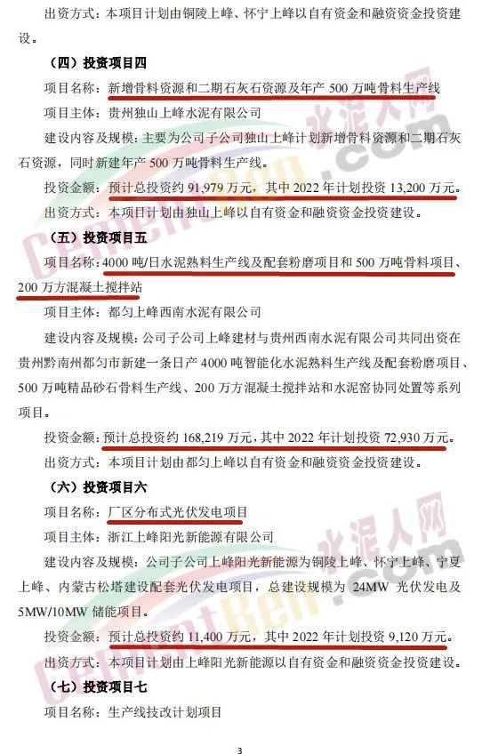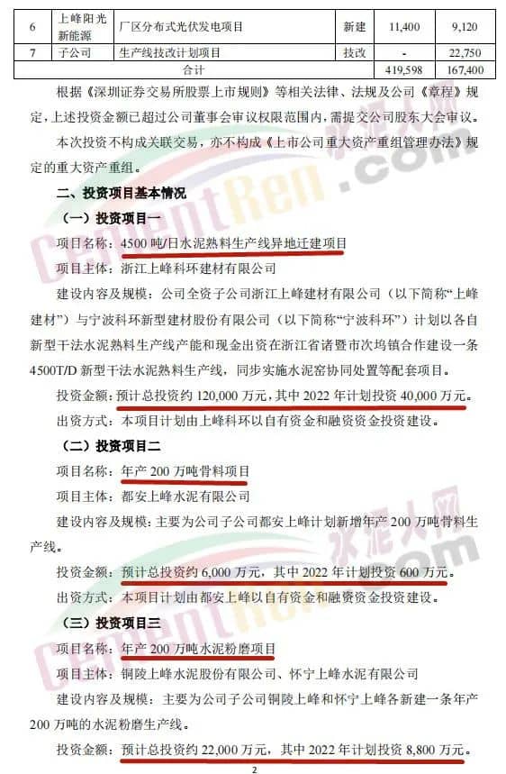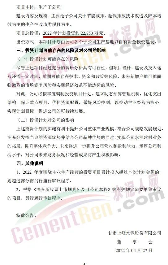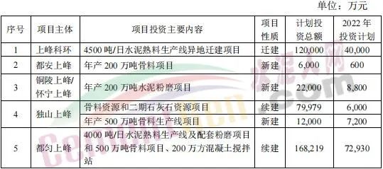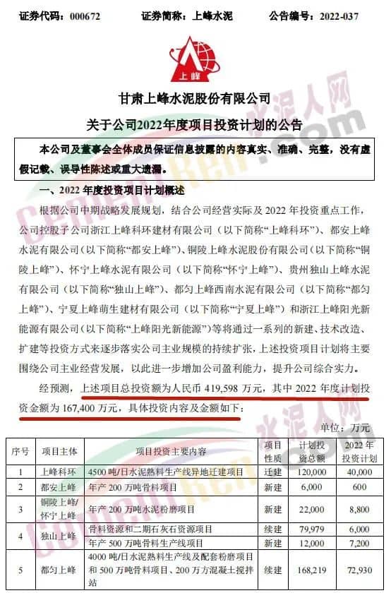 4月27日,甘肃上峰水泥股份有限公司发布《关于公司2022年度项目投资计划的公告》称,2022年,其控股子公司浙江上峰科环建材有限公司、都安上峰水泥有限公司、铜陵上峰水泥股份有限公司、怀宁上峰水泥有限公司、贵州独山上峰水泥有限公司、都匀上峰西南水泥有限公司、宁夏上峰萌生建材有限公司和浙江上峰阳光新能源有限公司等将通过一系列的新建、技术改造、扩建等投资方式来逐步落实公司主业规模的持续扩张。