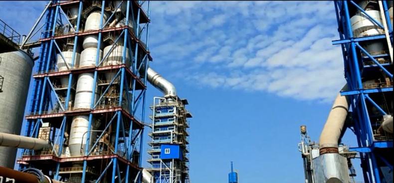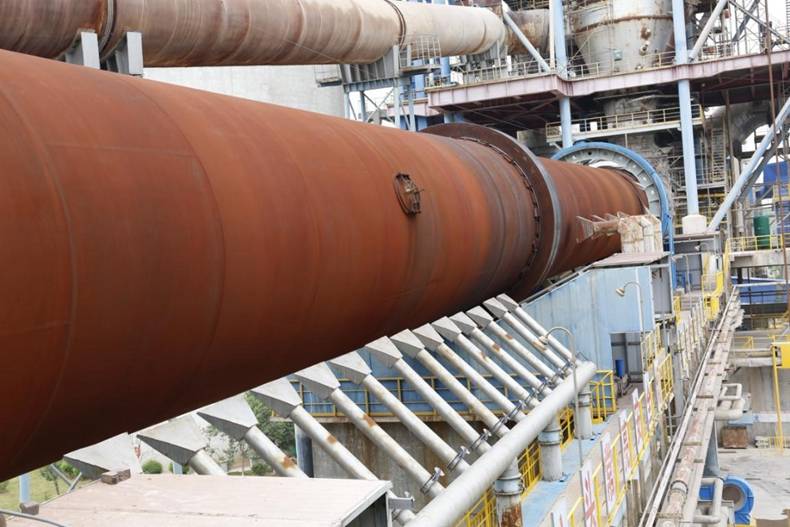 棕黄色的生粉经旋风预热器和分解炉等送到旋转的大窑内。