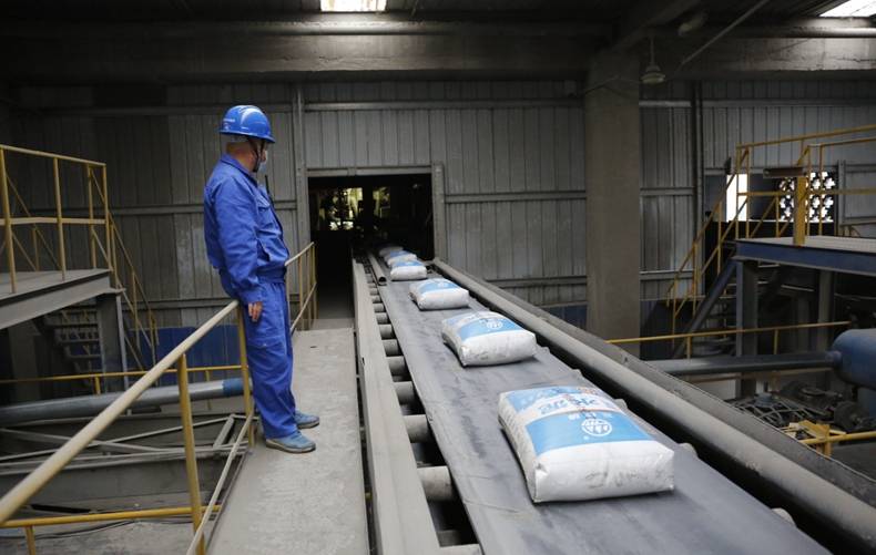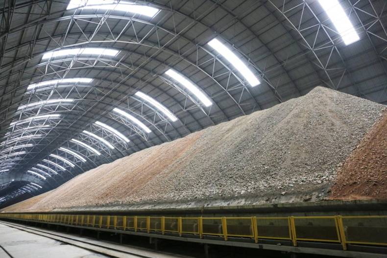 从矿山拉回的颗粒状石灰石以及各种炉渣和硅铝材料,经 生产部质量验收班验收后堆放到原料堆棚里,不同颜色的矿石让堆棚显得不那么单调。