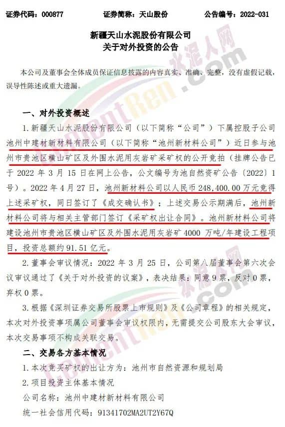 4月27日晚,天山股份公告,控股子公司池州新材料公司以24.84亿元竞得池州市贵池区横山矿区及外围水泥用灰岩矿采矿权。待《采矿权出让合同》签订后,池州新材料公司将建设“池州市贵池区横山矿区及外围水泥用灰岩矿4000万吨/年建设工程项目”,投资总额约91.51亿元,此次投资将增加公司骨料产能。