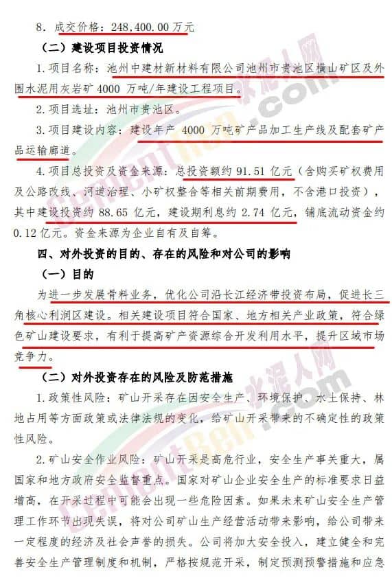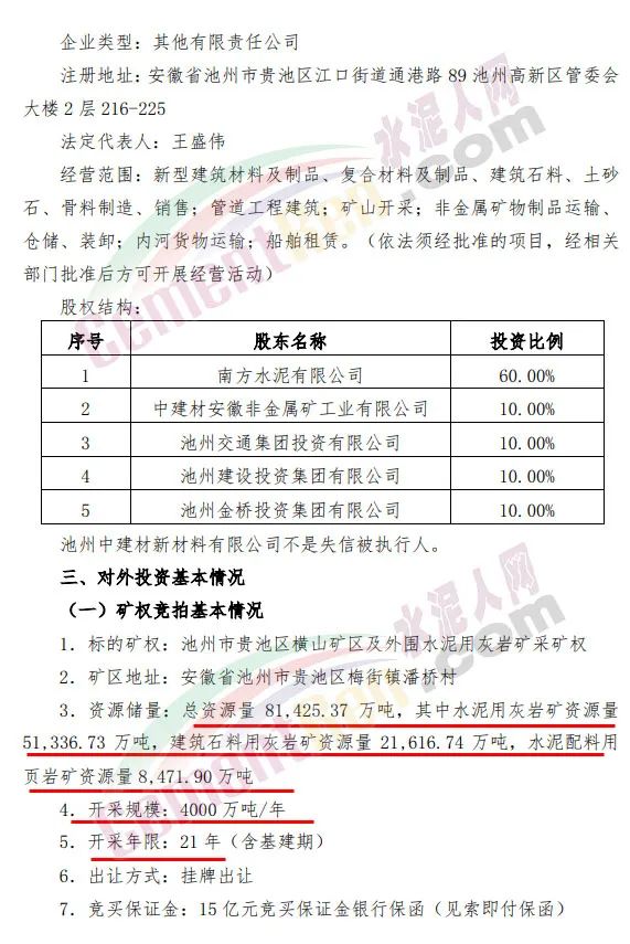 公告显示,此次标的矿权总资源量约8.14亿吨,其中水泥用灰岩矿资源量5.13亿吨、建筑石料用灰岩矿资源量2.16亿吨、水泥配料用页岩矿资源量8471.90万吨,开采规模为4000万吨/年,开采年限为21年。