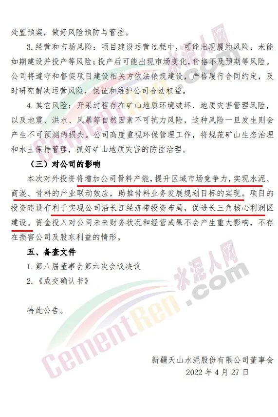 “进一步发展骨料业务,优化公司沿长江经济带投资布局,促进长三角核心区建设。”天山股份如此表示。公告全文如下:
