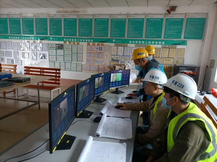 工人在监控室同时远程操作4个码头装卸作业