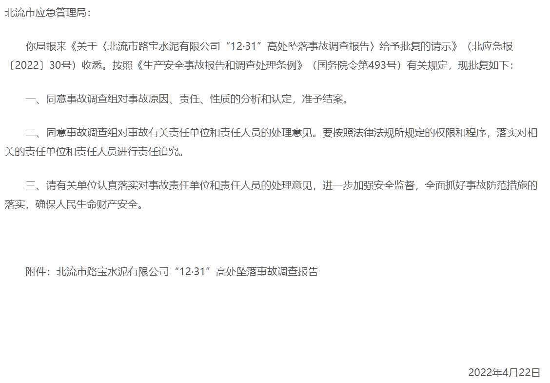 经调查,北流市路宝水泥有限公司“12·31”高处坠落事故是一起一般生产安全责任事故。