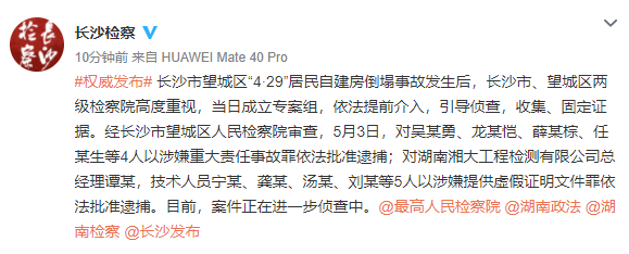 据湖南省长沙市人民检察院官方微博消息,长沙居民自建房倒塌事故发生后,长沙市、望城区两级检察院高度重视,当日成立专案组,依法提前介入,引导侦查,收集、固定证据。