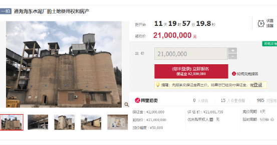 来自阿里拍卖频道的信息可见,即将开始的拍卖项目中涉及三家水泥企业机械设备或房产及土地使用权等拍卖。值得注意的三条拍卖信息围观人数几千人,报名人数均为“0”。
