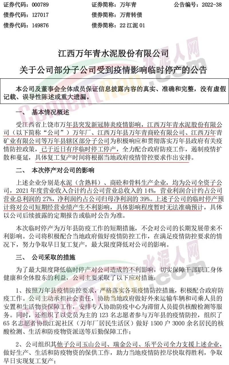 1、按照万年县疫情防控要求,严格落实各项疫情防控措施,积极配合政府防疫工作。公司主动承担社会责任,协助当地政府做好外来运输车辆和司乘人员的安置和生活物资保障工作,安排专人协助防疫中心为滞留人员提供核酸检测等服务。同时,还组织了以党员为主的123名志愿者参与万年县的疫情防控,组织了65名志愿者协助江泥社区(万年厂居民生活区)做好1500户3000余名居民的核酸检测、生活和防疫物资派送等后勤保障工作;