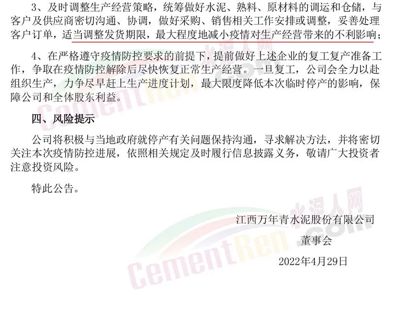 3、及时调整生产经营策略,统筹做好水泥、熟料、原材料的调运和仓储,与客户及供应商密切沟通、协调,做好采购、销售相关工作安排或调整,妥善处理客户订单,适当调整发货期限,最大程度地减小疫情对生产经营带来的不利影响;