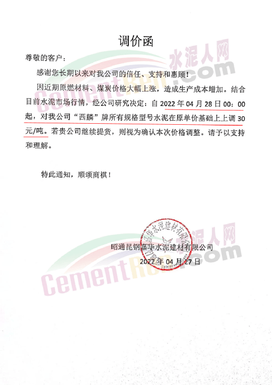 云南永保特种水泥有限责任公司通知,因各类水泥原材料的紧缺及价格上涨而导致生产成本的上升,故对水泥价格做出调整以缓解不断上涨的成本压力,自2022年4月30日0时起所有区域所有品种水泥在原价基础上上调 30元/吨。